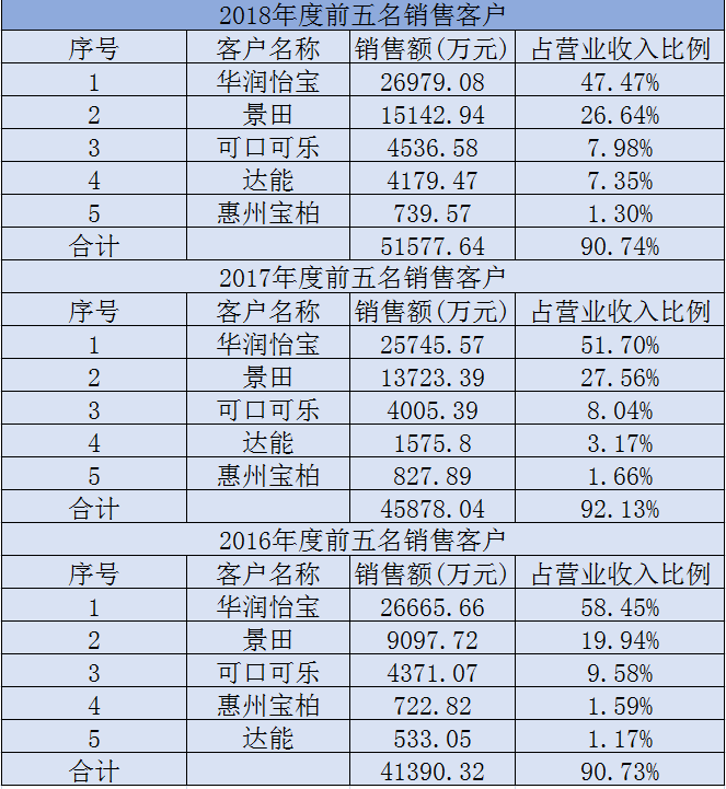 在客户方面,金富科技存在集中度较高的风险。招股书显示,2016年-2018年,金富科技前五大客户分别为华润怡宝、景田、可口可乐、达能和惠州宝柏,合计销售金额分别为4.14亿元、4.59亿元和5.16亿元,占营业收入的比例分别为90.73%、92.13%和90.74%。